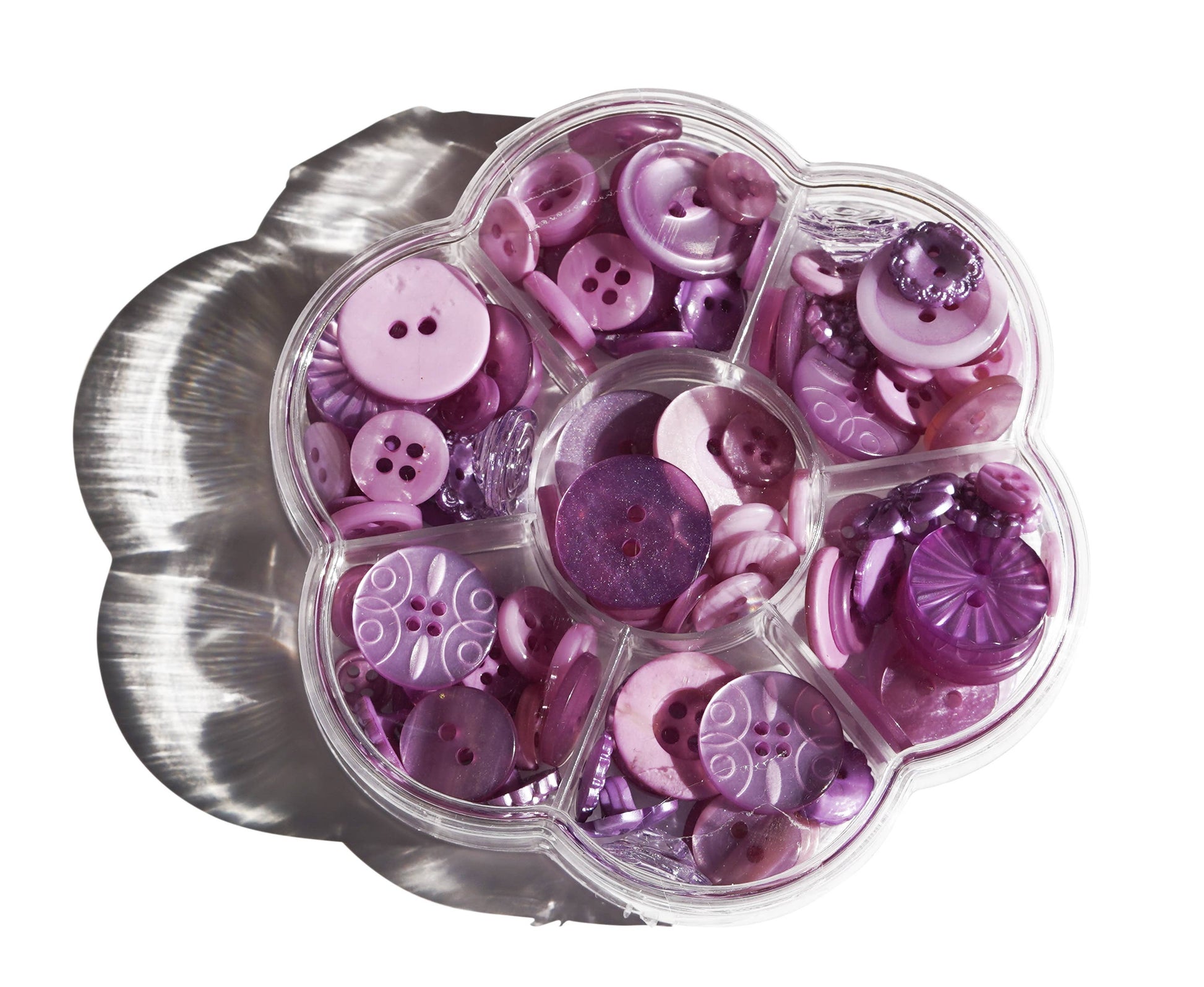 Bring a frosty sparkle to your sewing and craft projects with the Frozen Lake Treasure Box, a delightful collection of pearlized designer buttons in assorted shapes, sizes, and styles. Housed in a reusable, flower-shaped storage box, this set combines charm and practicality for every crafter.